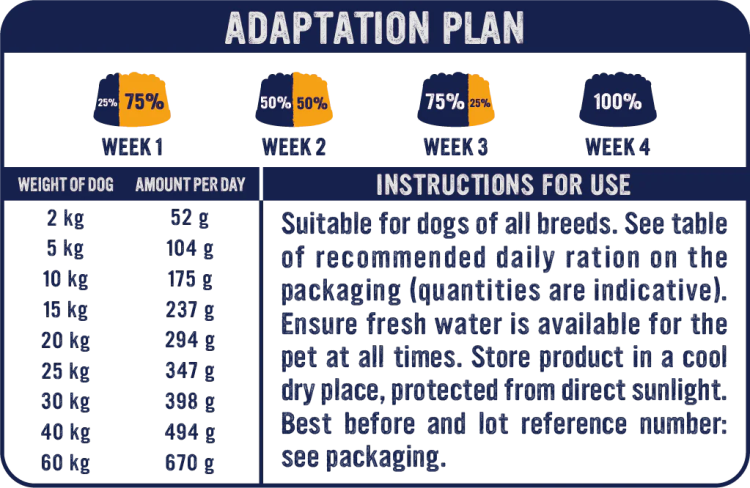 - See recommended daily ration table on the packaging (the quantities indicated are indicative).