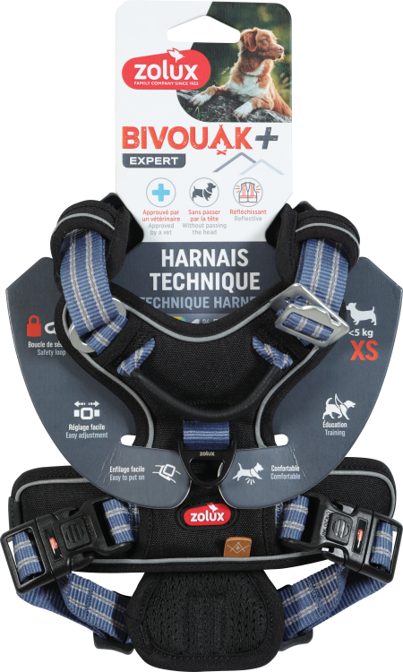 The Zolux Bivouak+ Expert Technical Harness (XS) is designed for small dogs under 5 kg. Part of the Bivouak+ Expert range, it features a Y-shaped design with padded chest and neck areas for comfort, reflective elements for visibility, and multiple leash attachment points, including an anti-pull front clip. It offers easy adjustments, a secure fit, and is simple to put on. The harness is vet-approved and suitable for training.