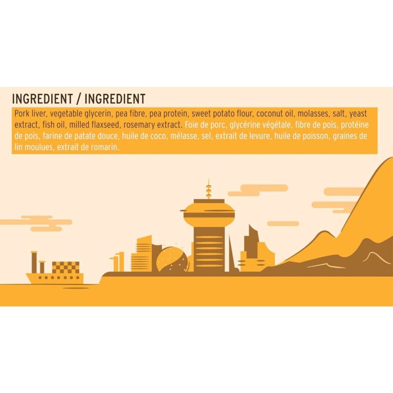 Pork Liver, Vegetable Glycerin, Pea Fibre, Pea Protein, Sweet Potato Flour, Coconut Oil, Molasses, Salt, Yeast Extract, Fish Oil, Milled Flaxseed, Rosemary Extract.