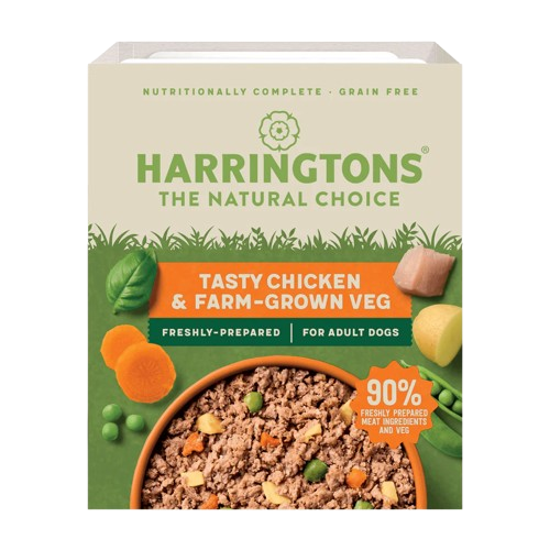 Harringtons Chicken With Potato & Vegetables Wet Dog Food is a premium, complete pet food for all adult dogs. The tray-cooked meals are both delicious and nutritious, made with 100% natural ingredients plus added vitamins and minerals. The grain-free recipe ensures wholesome nutrition without artificial colors, flavors, dairy, soya, or added wheat. Harringtons offers the benefits of high-quality pet foods. Made in the UK.