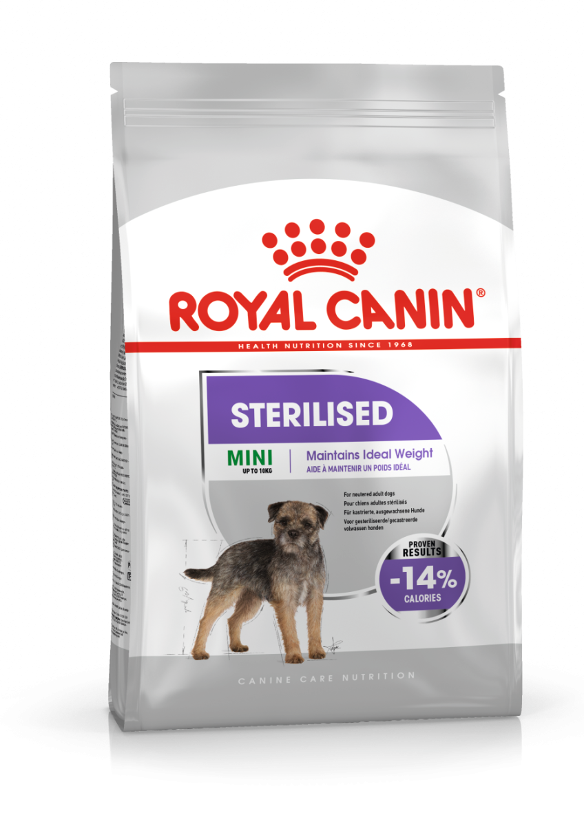 ROYAL CANIN Mini Sterilised Care is a nutritionally balanced diet for small, neutered adult dogs that weigh up to 10kg. This exclusive nutritional profile helps to support a healthy body weight while also helping your dog to feel full and satisfied between meals. · Specially formulated for small dogs · Reduces calorie intake · Supports ideal weight management · 14% fewer calories than regular dog food This product is also available as wet food in a delicious pâté loaf. If you tend to feed your dog a mix of wet and dry food, be sure to follow the feeding guidelines for accurate amounts.