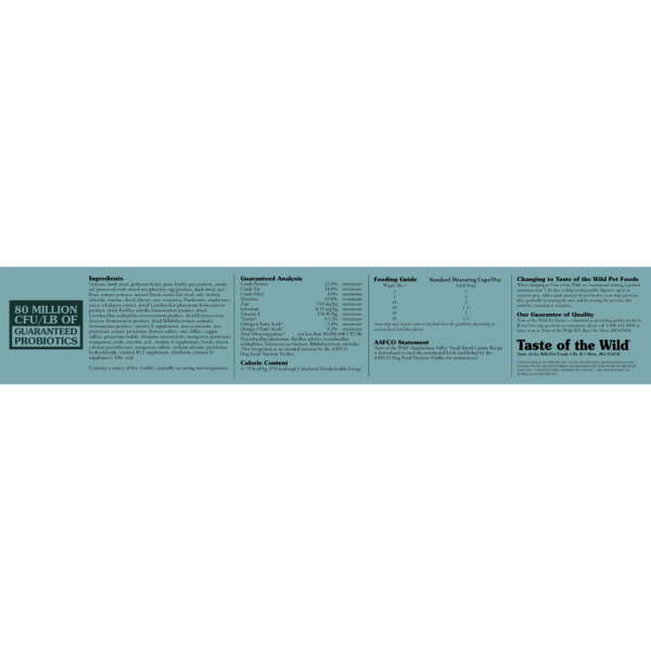 Taste of the Wild Appalachian Valley Small Breed Canine Recipe is formulated to meet the nutritional levels established by the AAFCO Dog Food Nutrient Profiles for maintenance.