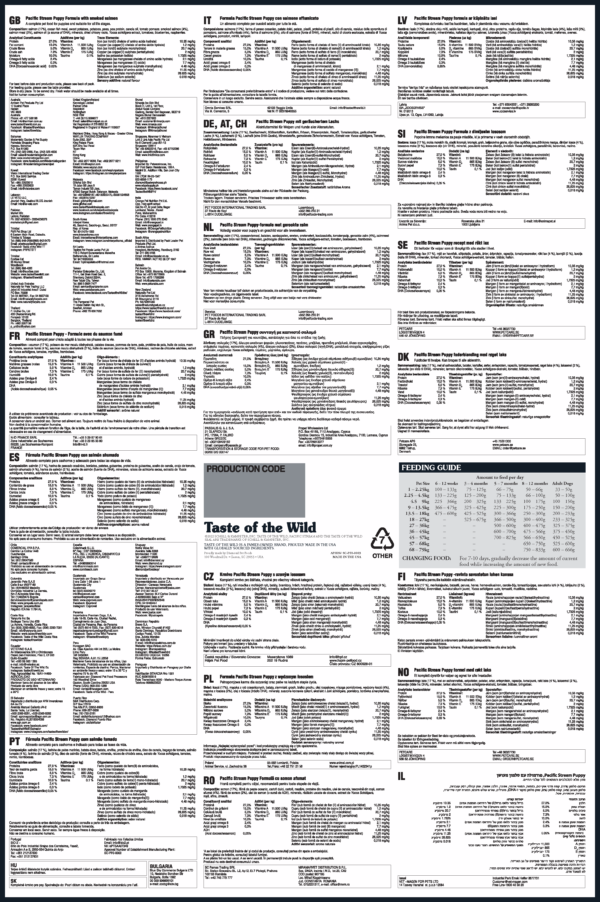 Taste of the Wild Pacific Stream Puppy Recipe is formulated to meet the nutritional levels established by the AAFCO Dog Food Nutrient Profiles for All Life Stages including growth of large size dogs (70 lbs. or more as an adult).