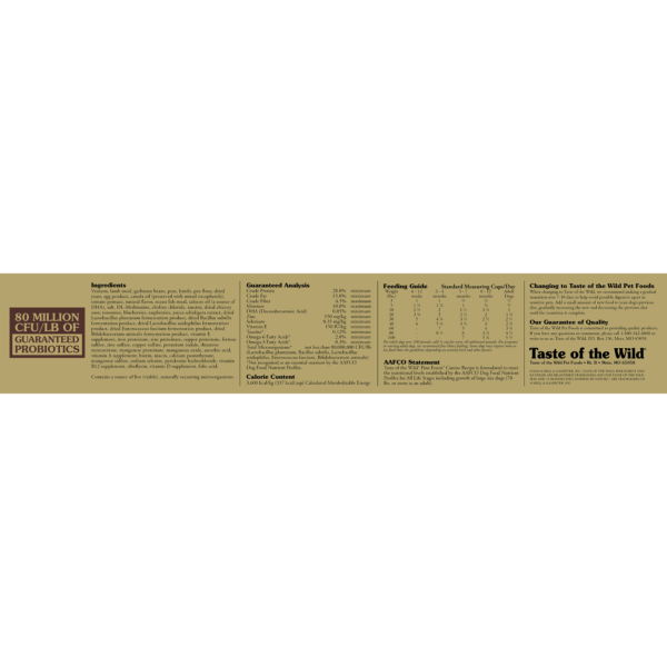 Taste of the Wild Pine Forest Canine Recipe is formulated to meet the nutritional levels established by the AAFCO Dog Food Nutrient Profiles for All Life Stages including growth of large size dogs (70 lbs. or more as an adult).