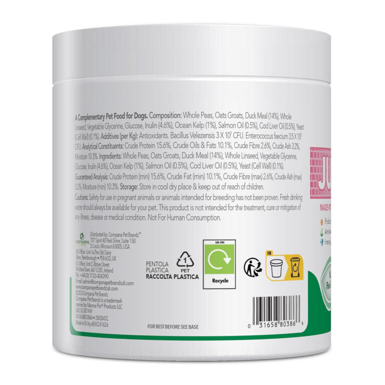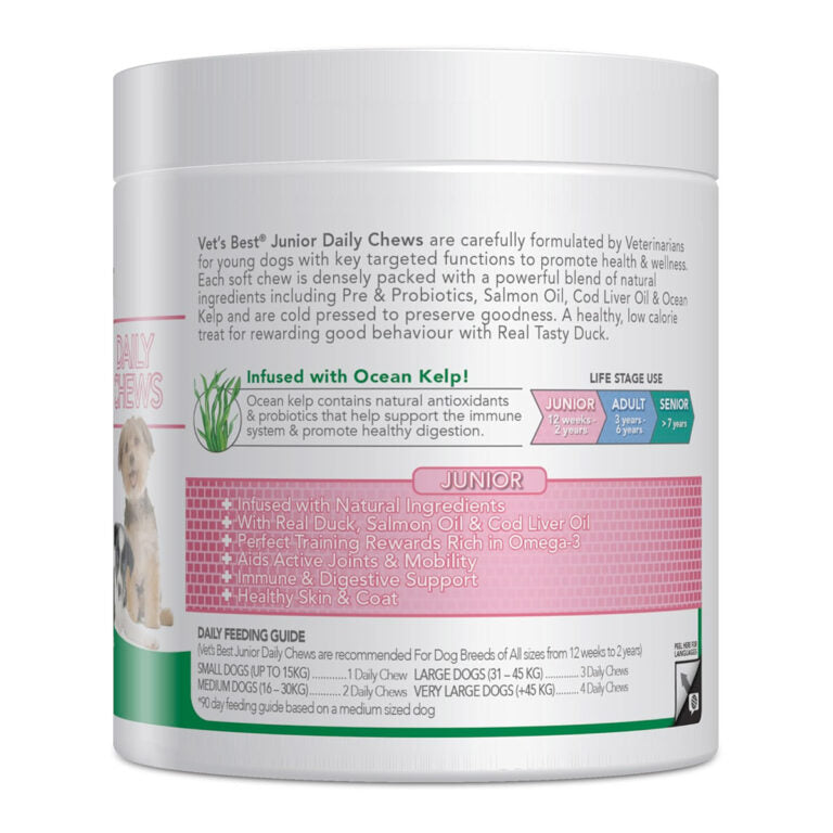 Vet’s Best® Junior Daily Chews are carefully formulated by Veterinarians for young dogs with key targeted functions to promote health & wellness. Each soft chew is densely packed with a powerful blend of natural ingredients including Pre & Probiotics, Salmon Oil, Cod Liver Oil & Ocean Kelp and are cold pressed to preserve goodness. A healthy, low calorie treat for rewarding good behaviour with Real Tasty Duck.
