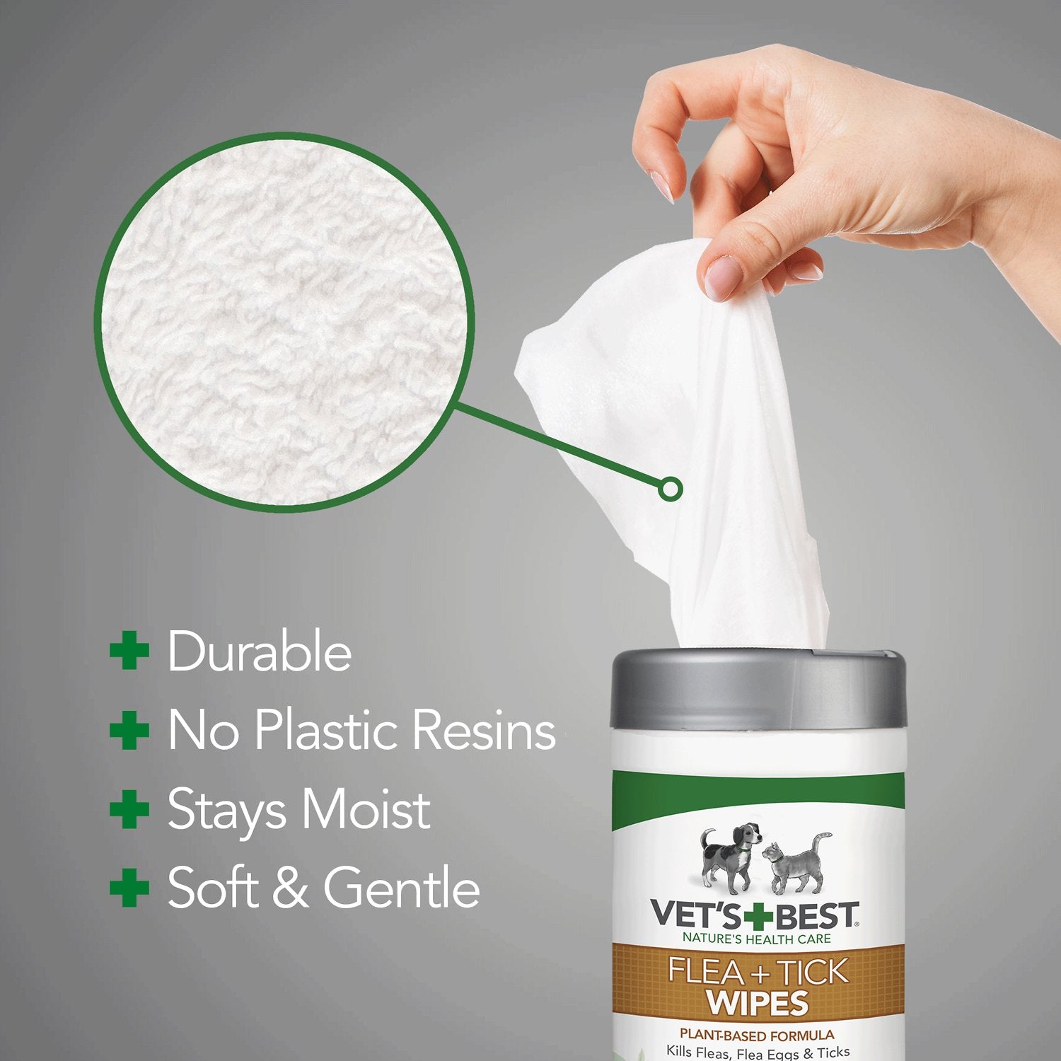 When fleas and ticks have your home and pet under assault, Vet’s Best Dog Flea + Tick Dog & Cat Wipes fight back with a unique blend of certified natural essential oils and plant-based ingredients. Peppermint oil and clove extract (eugenol) help control and kill fleas, flea eggs, and ticks on contact, and also repels mosquitoes too! It uses absolutely no chemical pyrethrins, permethrins or cedar oil, so it’s safe for the whole family. The non-staining formula is great for home surfaces like countertops, baseboards, pet bedding and collars, so it can be used everywhere you need it. Safe for use on or around dogs and cats 12 weeks or older.