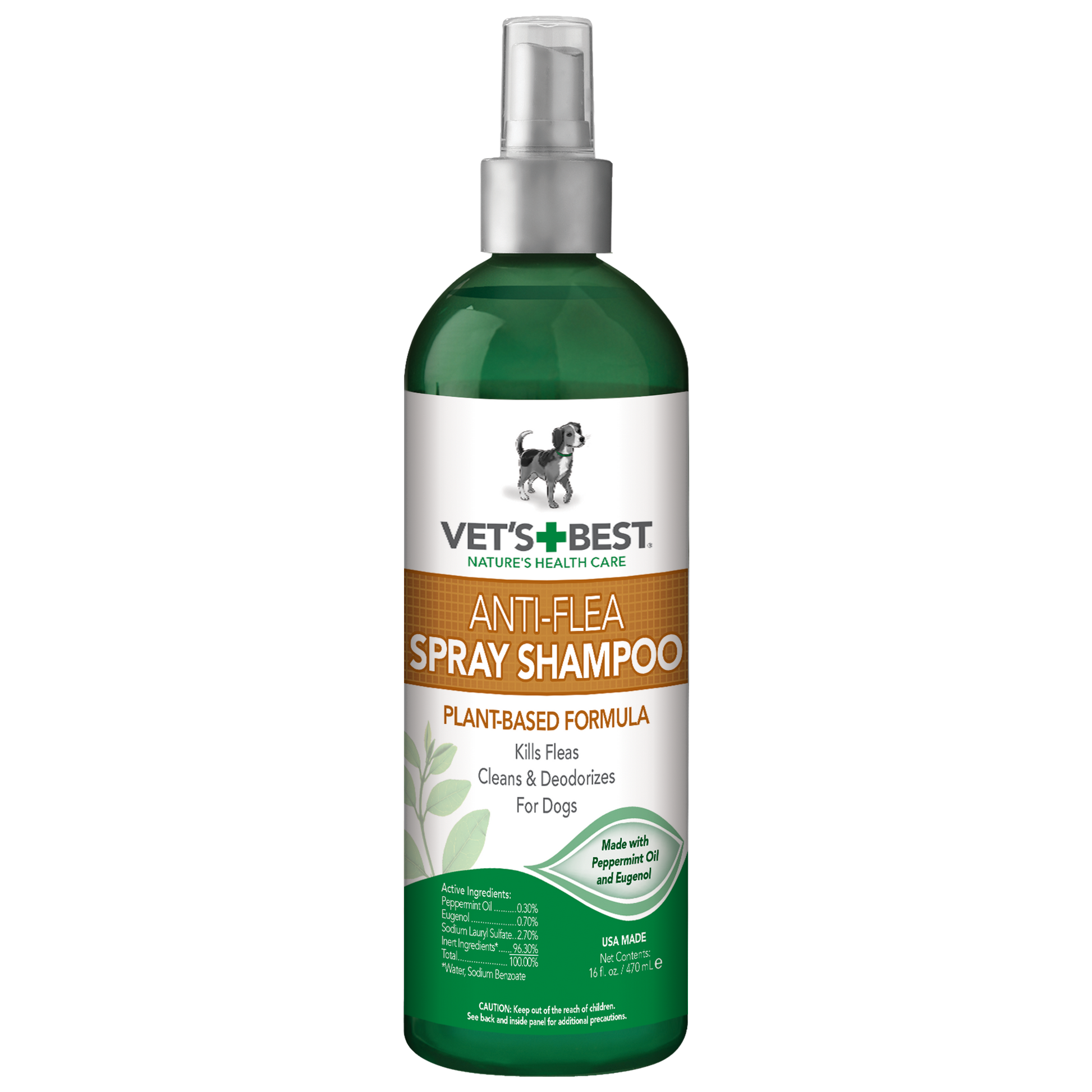 - VET’S BEST ANTI-FLEA SPRAY SHAMPOO kills fleas by contact without harsh chemicals, but rather with certified natural essential oils and plant-based ingredients, such as peppermint oil and eugenol (from clove plants).